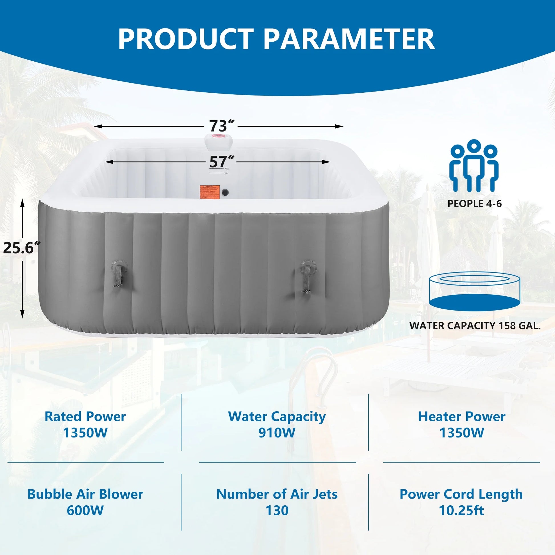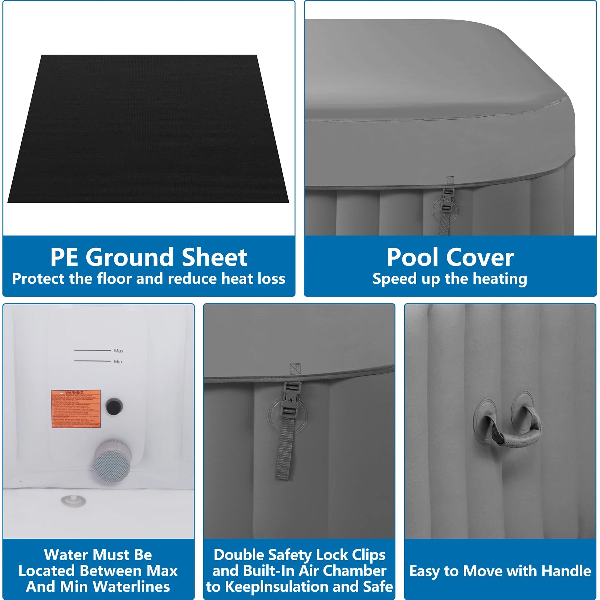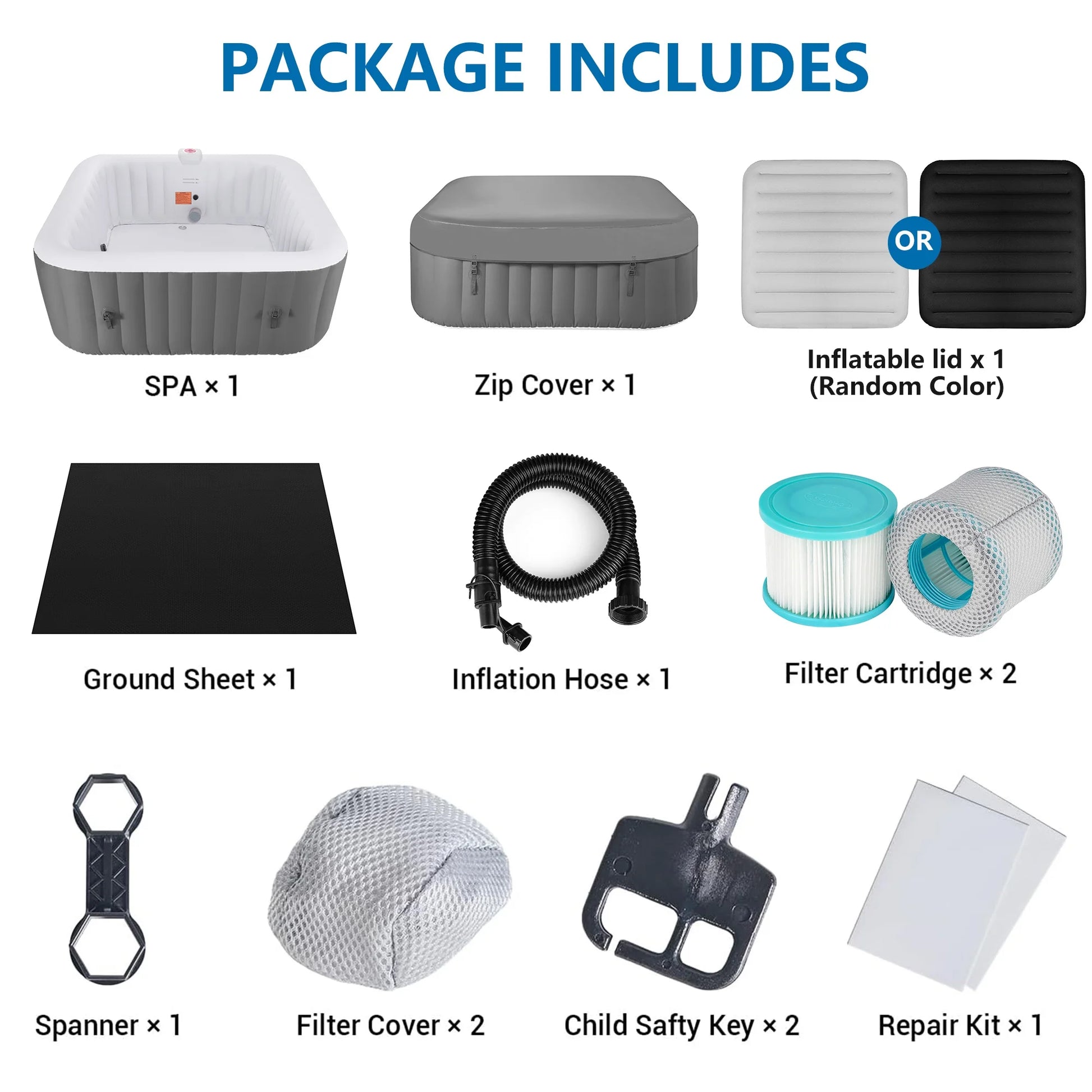 【Ideal for 4-6 Adults】Our square blow-up hot tub accommodates 4-6 adults, letting you and yours fully enjoy your leisure time at home, on your patio, in the backyard, or elsewhere.